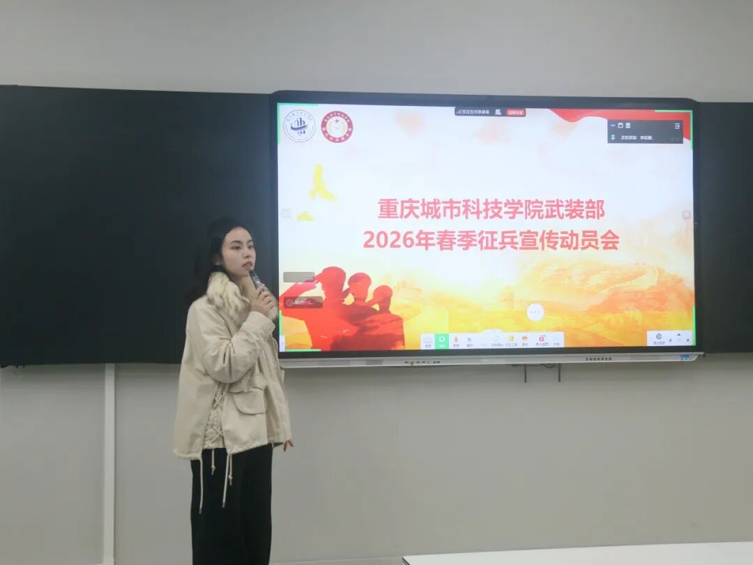 为扎实推进国防教育工作,激发在校学生参军报国热情,12月24日下午,学校武装部在永川校区主教514教室召开2026年春季征兵宣传动员会。本次会议由武装部指导老师李欣蔓主持,全体春季意向入伍学生参与其中。 会议伊始,李欣蔓老师围绕征兵政策体系、标准要求、流程安排和发展路径等关键内容进行了系统深入的解读。她结合详实数据和生动案例,全面介绍了国家面向高校毕业生推出的系列优待政策,深刻阐释了参军入伍对青年学生成长发展的全方位促进作用。李老师强调,军营不仅是锤炼意志品格的特殊课堂,更是实现人生价值的重要舞台,新时代大学生应当把握历史机遇,将个人理想融入强国强军伟业。她通过清晰的流程图和时间轴,系统讲解了从报名应征到批准入伍的全流程,并针对学生关切问题给予了专业指导和建议。 现场答疑环节,同学们围绕政策衔接、专业发展、应征准备等问题踊跃提问,李老师逐一细致解答,现场气氛热烈,坚定了同学们参军报国的决心。 高校大学生应征入伍是推进国防现代化建设、实现强军目标的重要举措,也是高校落实立德树人根本任务的具体实践。未来,学校将持续强化国防教育宣传,扎实做好征兵宣传动员工作,为部队输送更多优秀青年人才,助力青年学子在军营中书写热血青春篇章!