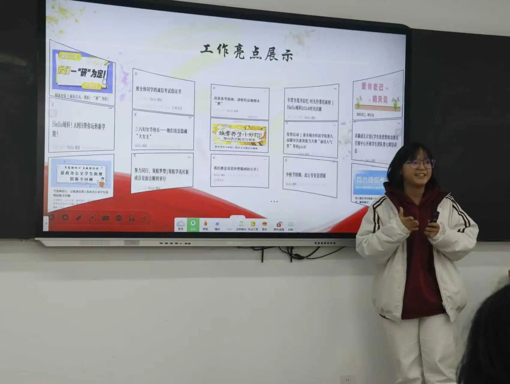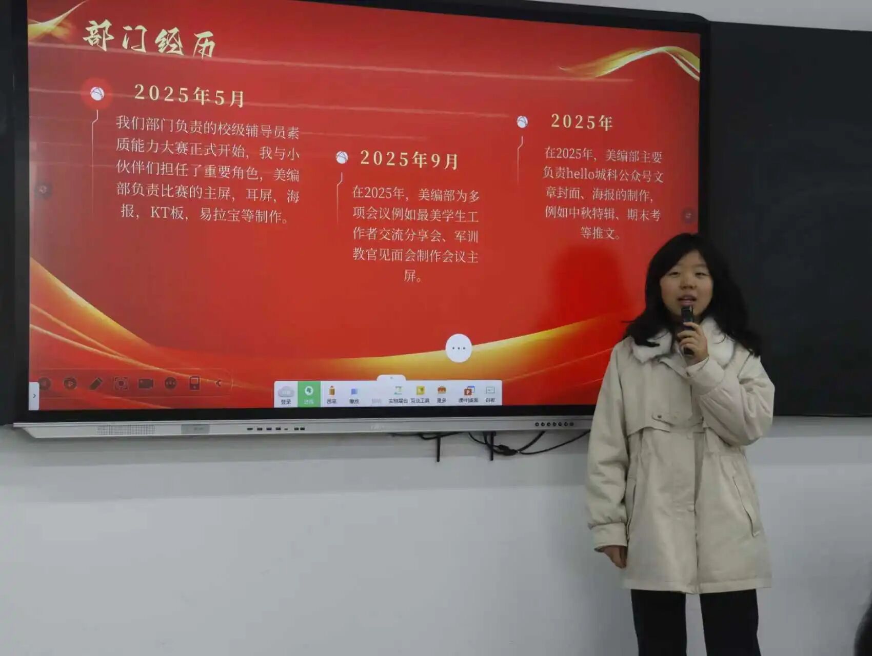 为进一步强化思想引领,树立先进标杆,凝聚奋进力量,12月26日,重庆城科学生处思政科2025年度勤工助学岗&Hello城科总结暨表彰大会在第五教学楼114教室举行。思想政治教育引领中心指导老师曾卓、万平及全体学生助理齐聚一堂,共话成长。会议由黄正阳同学主持。 01 各组述职 大会伊始,文编、运营、摄制、美编及思政五个部门代表依次进行年度述职。他们不仅复盘了一年来的高光时刻与丰硕成果,更以问题为导向,深刻剖析了工作中的短板与挑战。代表们纷纷表示,将以此次述职为契机,进一步明确改进方向,凝聚团队合力,砥砺前行,推动团队工作迈上新台阶。 02 颁奖仪式 随后,大会举行了颁奖仪式。曾卓、万平老师分别为荣获“优秀组员”和“优秀组长”称号的学生代表颁发了荣誉证书与奖品,对他们的辛勤付出给予了充分肯定。 03 总结讲话 颁奖仪式后,两位老师发表总结讲话。万平老师对大家寄予殷切期望,勉励大家保持昂扬向上的精神风貌,在新的一年里凝心聚力,再创辉煌。曾卓老师则高度评价了团队一年来的辛勤耕耘与卓越成效,并对未来工作提出具体要求,希望大家精进办公技能,全面提升工作质效。 04 合影留念 大会最后,全体人员移步至草坪合影留念。镜头定格下的一张张笑脸,不仅记录着过去一年的汗水与荣耀,更寄托着对未来的无限憧憬。 本次思政科暨Hello城科年度总结暨表彰大会圆满落下帷幕。此次大会不仅是对过去一年工作的全面检阅,更是对未来发展的一次全新动员。全体成员将以此次大会为新的起点,带着这份荣誉与鼓励,在今后的工作中以更加饱满的热情、更加务实的作风,续写团队发展的新篇章,为思想政治教育宣传工作贡献新的更大力量。